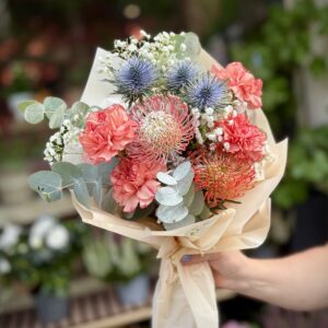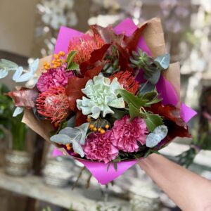 35,00 €«Accent de Tardor» és un ram amb protees, clavells, una suculenta i eucaliptus. Una elecció vibrant i elegant per als amants de les composicions úniques.