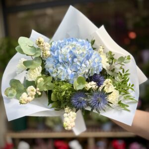 25,00 €Ram fresc i lleuger en tons blaus i blancs amb hortènsia, eryngium i symphoricarpos. Elegant i contemporani.