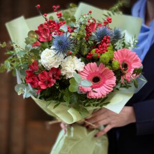 25,00 €Ramo de gerberes, clavells, crisantems, alstroemèries, eucaliptus, flors seques i altres flors.