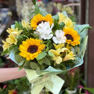 25,00 €Un ram amb gira-sols i alstromèries que transmet alegria i calidesa. Un gest lluminós i ple de vida.