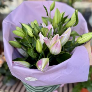 20,00 €Ram Elegància de lliris amb lliris aromàtics i flors fresques. Sempre disponible a la botiga. Ram de mida mitjana.