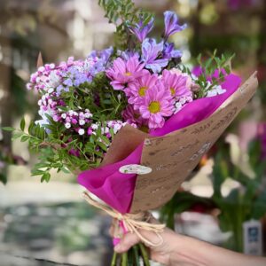 30,00 €Ramo de crisantems, mini clavells, statice i verd decoratiu. Embolicat en paper lila. Mida mitjana.