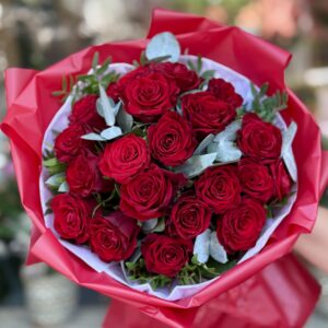 36,00 €«Clàssic de Passió» és un ram de 21 roses vermelles de 30 cm d’alçada, complementat amb verds suaus i fulles platejades d’eucaliptus. Una elecció refinada i romàntica per a qualsevol ocasió especial.