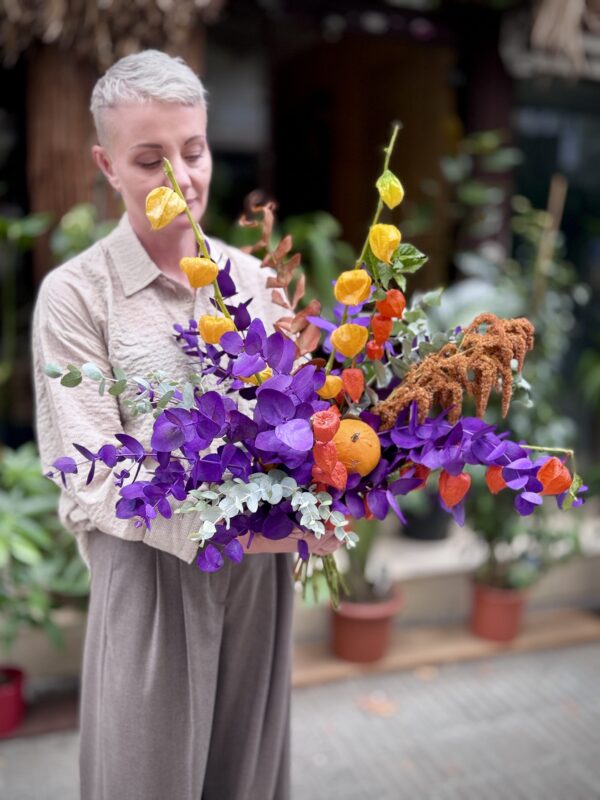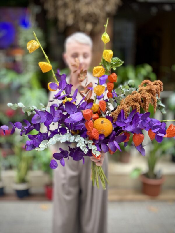 Una composició plena de contrastos i intensitat: eucaliptus tenyit en violeta, fanalets de fisalis en taronja i groc, un toc càlid d’amarant i una petita carabassa decorativa. La barreja d’elements i textures converteix aquest ram en una autèntica peça d’art floral. L’assimetria li dóna dinamisme i els colors vius el fan perfecte per regalar, decorar o sorprendre en qualsevol ocasió.