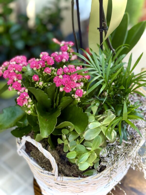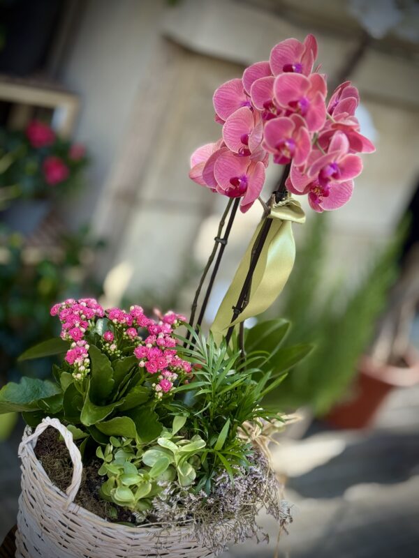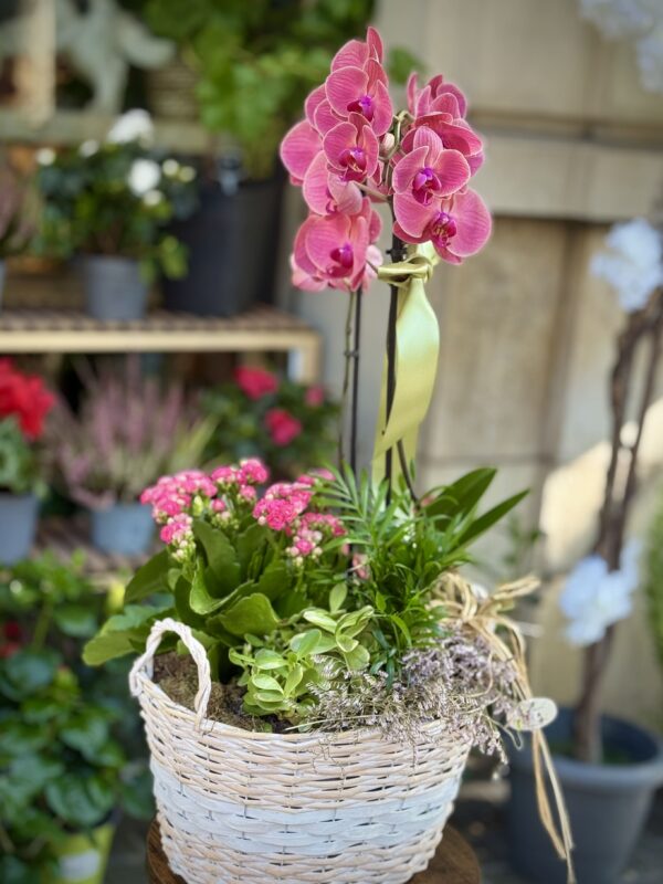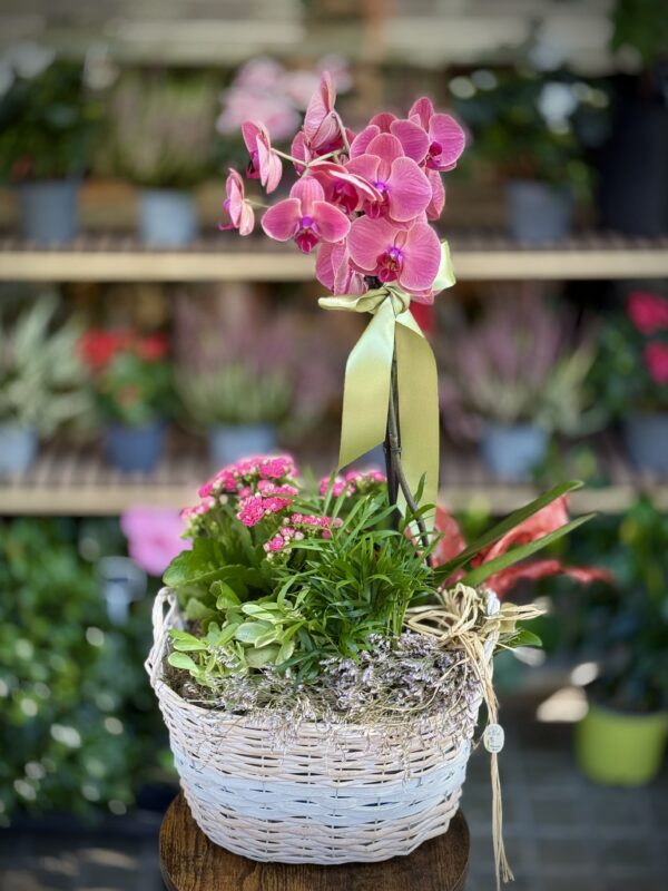 Una composició elegant amb plantes vives, on l’orquídia phalaenopsis rosa, el kalanchoe, la cràssula suculenta i la palmera chamaedorea creen una harmonia de formes i tons naturals. La cistella està decorada amb flors seques i molsa, donant-li un aspecte complet i acurat. Ideal per a casa, oficina o balcó. Cura mínima — màxim encant i bellesa.