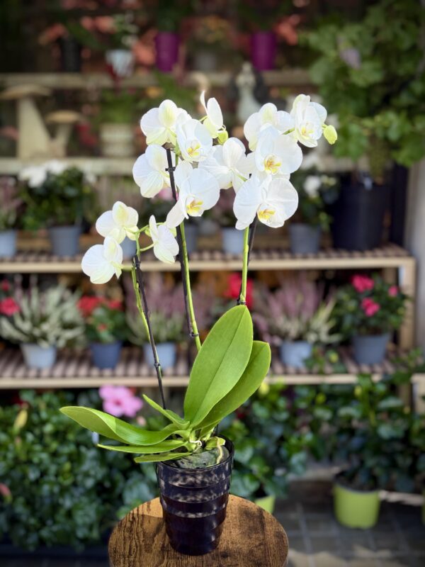 Important: la planta es ven en un test tècnic de plàstic amb terra. El test ceràmic de colors que apareix a la imatge es ven per separat. Amb la compra, l’orquídia s’embolica amb paper decoratiu — bonic i polit.