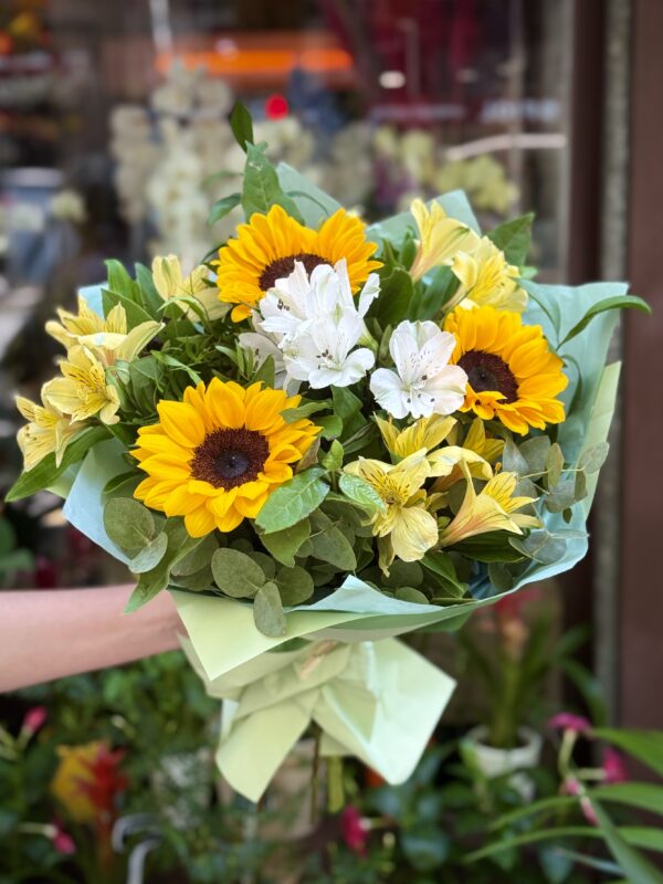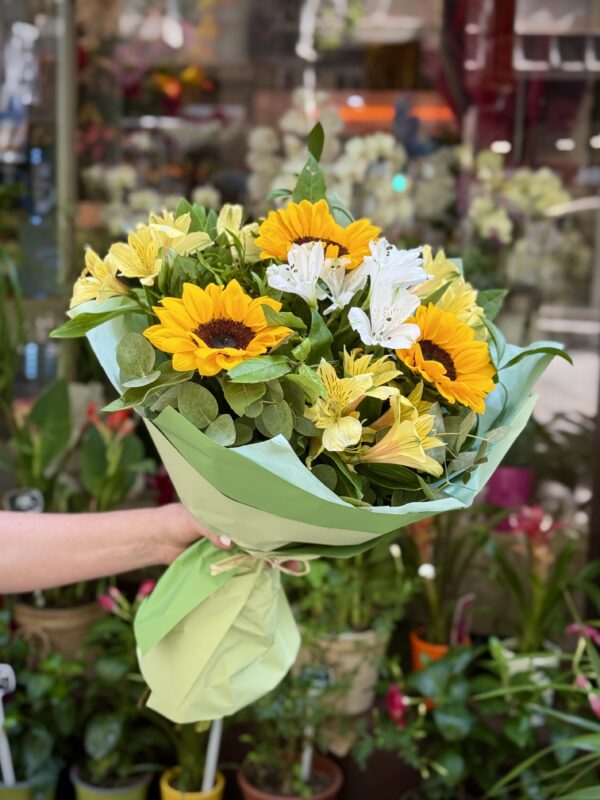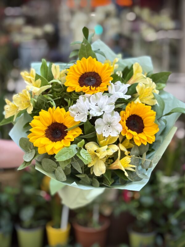 Aquest ram està pensat per omplir de somriures i optimisme qualsevol ocasió. Els gira-sols, símbol de llum i vitalitat, són el centre de la composició, mentre que les alstromèries blanques hi aporten puresa i les grogues un toc vibrant i energètic. L’eucaliptus completa el conjunt amb un toc fresc i natural. És un regal perfecte per a aniversaris, celebracions o simplement per sorprendre algú amb una dosi de felicitat i llum.