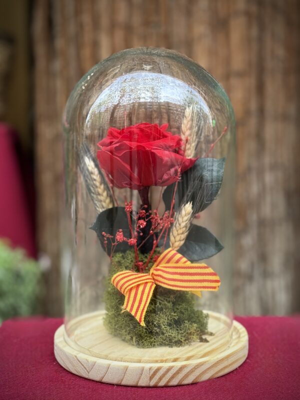 La composició «Rosa Eterna con Senyera» està pensada per a aquells que valoren tant la bellesa com la tradició. Al centre hi ha una delicada rosa eterna, envoltada de molsa i elements decoratius, protegida sota una cúpula de vidre. La cinta amb els colors de la Senyera, la bandera històrica de Catalunya, aporta una simbologia especial, convertint la peça en molt més que una decoració: un gest de respecte i amor per la cultura catalana.