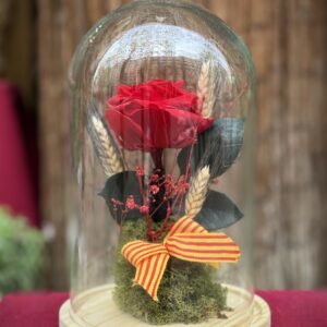 Aquesta composició reflecteix la bellesa eterna i la força dels sentiments. Una rosa vermella preservada, protegida sota una cúpula de vidre amb base de fusta, manté la seva frescor i color intens durant molts anys. La seva elegància es veu ressaltada per la gypsophila verda i petits detalls decoratius que creen una atmosfera d’harmonia i romanticisme. Un regal únic i inoblidable que transmet amor i emoció sense necessitat de paraules.