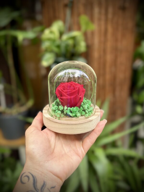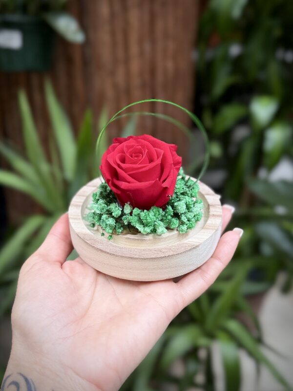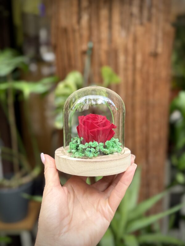 Aquesta composició reflecteix la bellesa eterna i la força dels sentiments. Una rosa vermella preservada, protegida sota una cúpula de vidre amb base de fusta, manté la seva frescor i color intens durant molts anys. La seva elegància es veu ressaltada per la gypsophila verda i petits detalls decoratius que creen una atmosfera d’harmonia i romanticisme. Un regal únic i inoblidable que transmet amor i emoció sense necessitat de paraules.