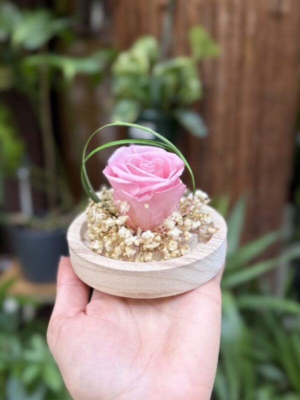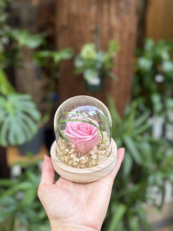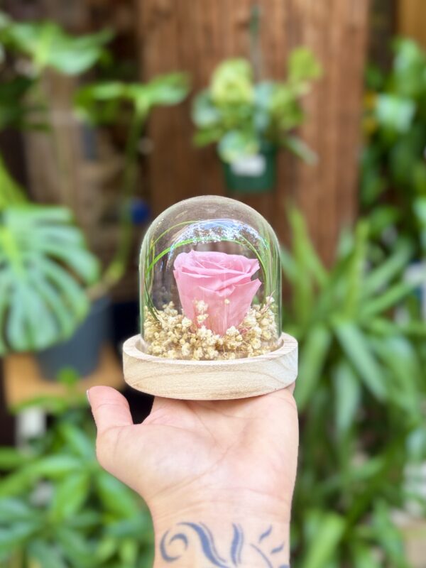 La rosa preservada sota una campana de vidre amb base de fusta és un símbol refinat d’eternitat. Aquesta flor conserva la seva bellesa per sempre, sense necessitat de cures, i sempre es veu fresca. Amb l’afegit de flors seques, aquesta composició es converteix en un element decoratiu ple de romanticisme i elegància per a la llar.