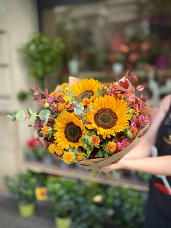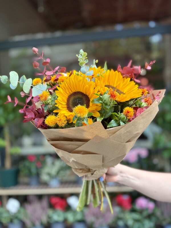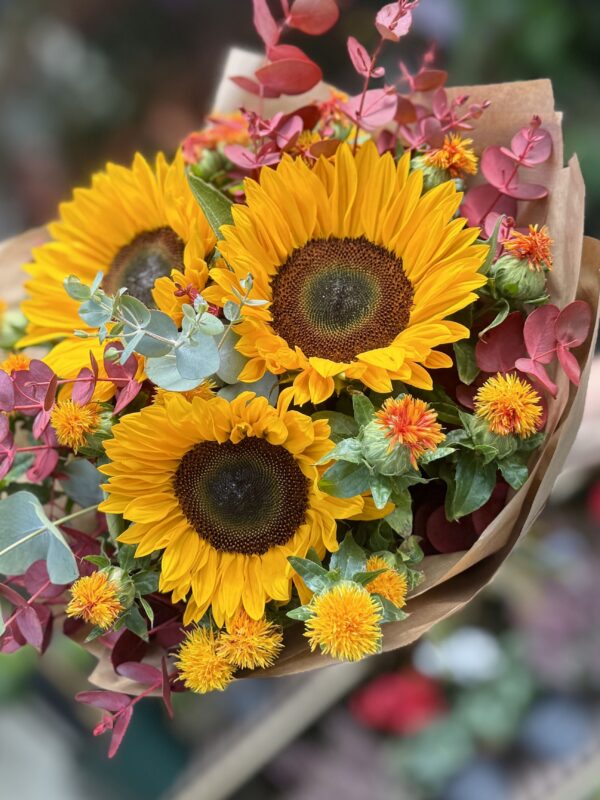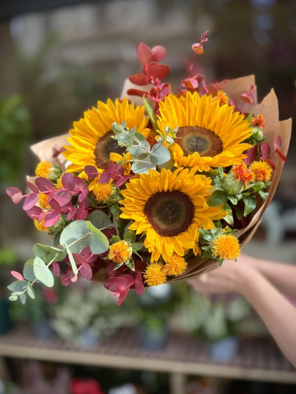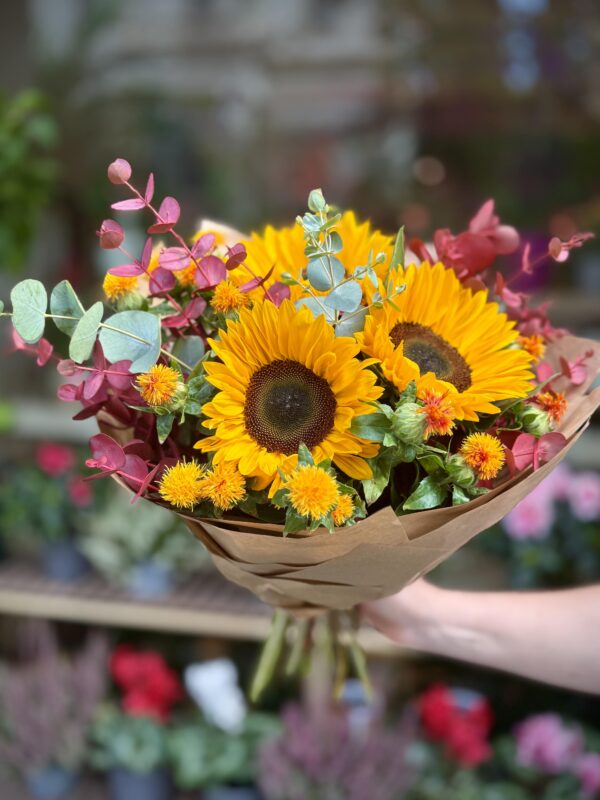 Aquest ram està creat amb un contrast d’tons càlids i frescos. Els gira-sols transmeten llum i energia, el cártamo aporta dinamisme i textura, i l’eucaliptus vermell combinat amb el platejat genera un diàleg cromàtic elegant i una silueta equilibrada. Una composició fresca i festiva, perfecta tant per a decorar la llar com per acompanyar qualsevol celebració.